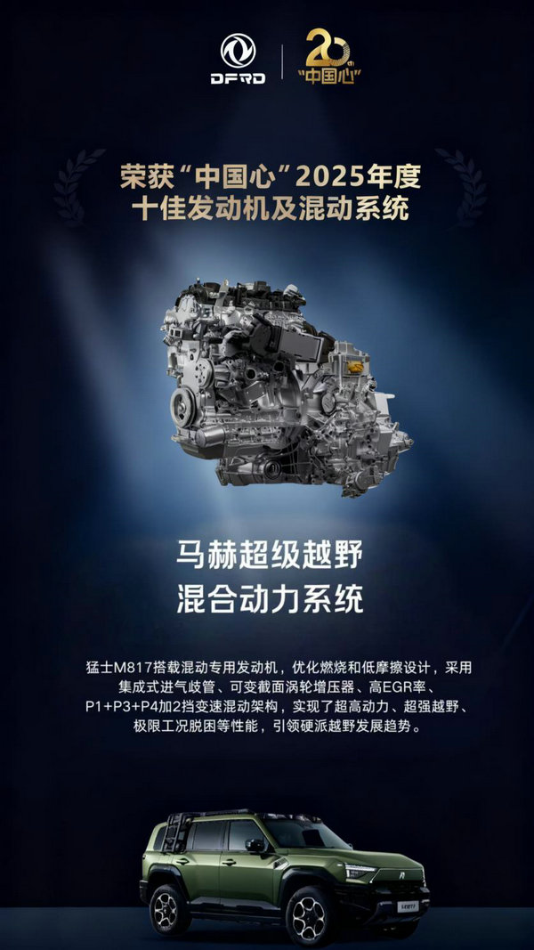 东风自主动力再次迎来高光时刻。近日,“中国心”2025年度十佳发动机及混动系统评选结果揭晓,东风汽车自主研发的马赫超级越野混合动力系统斩获“中国心”2025年度十佳发动机及混动系统大奖。这是马赫动力自首次亮相以来,连续六年获此殊荣,既彰显了东风汽车积淀深厚的技术功底,更标志着中国品牌在新能源越野动力领域的技术突破与领先地位。