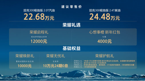 2025年12月11日,在坦克300全球用户达成50万之际,坦克300极地版正式上市。官方建议零售价,坦克300极地版2.0T汽油22.68万元,坦克300极地版2.4T柴油24.48万元,并推出荣耀启程礼、心想事橙新年红包和多项基础权益等多重购车礼遇。