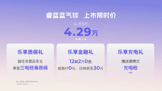 同时,睿蓝蓝气球在上市之际也推出多重惊喜好礼,涵盖首任非营运车主享受三电终身质保、12期2万0息或首付0元,日供低至30元金融礼、赠送1把便携式充电枪,进一步减轻用户拥车压力。即日起,消费者可通过睿蓝汽车官方APP、小程序或授权经销商渠道了解详情、预约试驾,并可享首批车主专属礼遇。