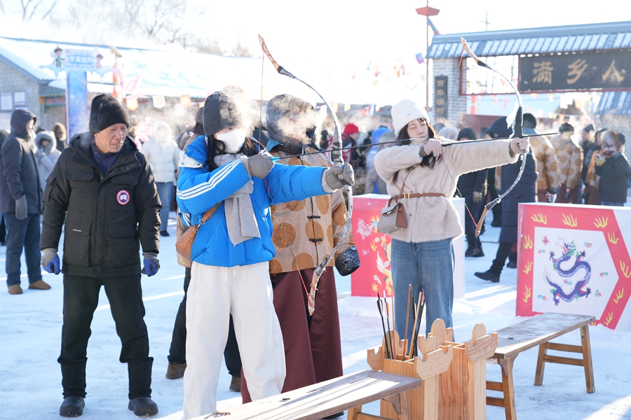 游客在黑河小乌斯力村体验满族民俗。新华社发(樊思雨 摄)