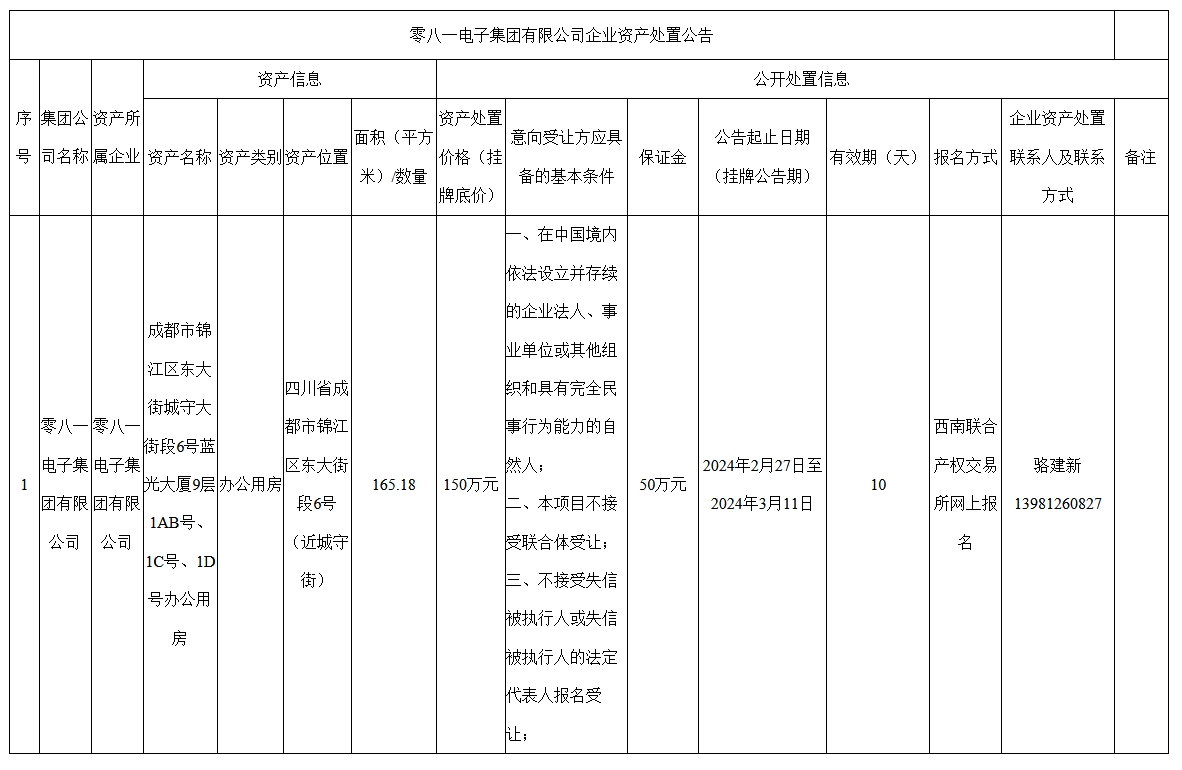 零八一电子集团有限公司企业资产处置公告