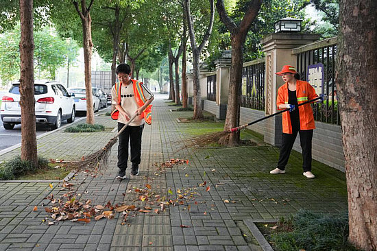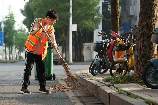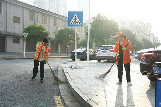 周末的清晨,在湖南省常德市武陵区芙蓉路上,有一位少年陪着母亲清扫路面。两人身着橙色马甲的身影成为芙蓉路一道特殊的风景。