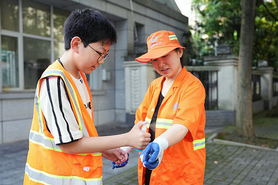 5月25日,周奕唯(左)在清扫马路前帮妈妈喷防蚊药。
