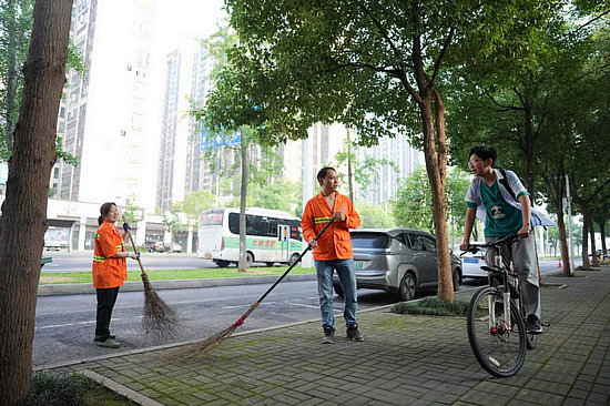 5月24日,周奕唯(右)骑车上学经过芙蓉路时和爸爸、妈妈打招呼。工作日,爸爸会帮助妈妈扫马路,到了周末,则由周奕唯帮忙。