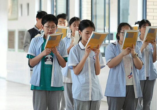 5月24日,周奕唯(前左)在学校早读。