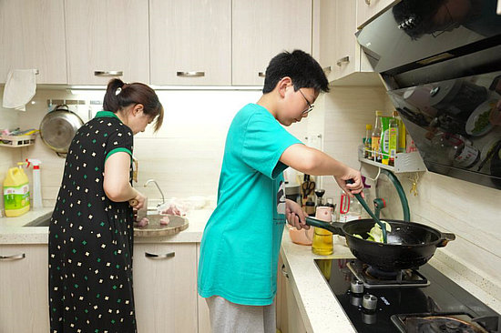 5月24日傍晚,周奕唯(右)在家中帮助妈妈做饭。