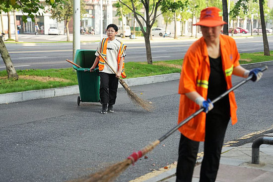 5月25日,周奕唯(右)和表弟周念纯在常德市芙蓉路上清扫路面。表弟得知周奕唯的故事后也来帮忙清扫道路。