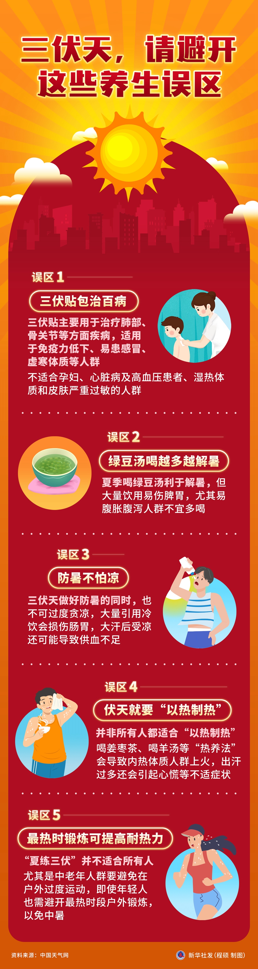 今年7月15日入伏。三伏天防暑降温是重中之重,各种养生方法层出不穷,但并非适合所有人,避开以下五大误区,助您科学养生。