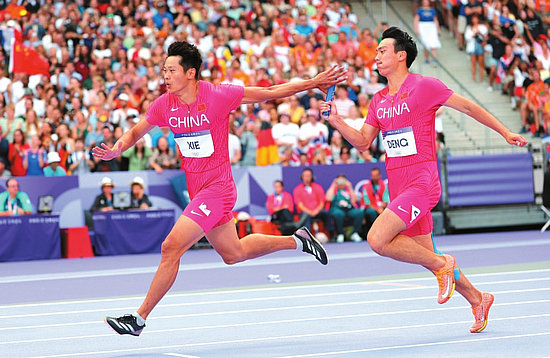 8月8日,中国队选手谢震业和邓智舰(右)在比赛中交接棒。(新华社记者 李明 摄)