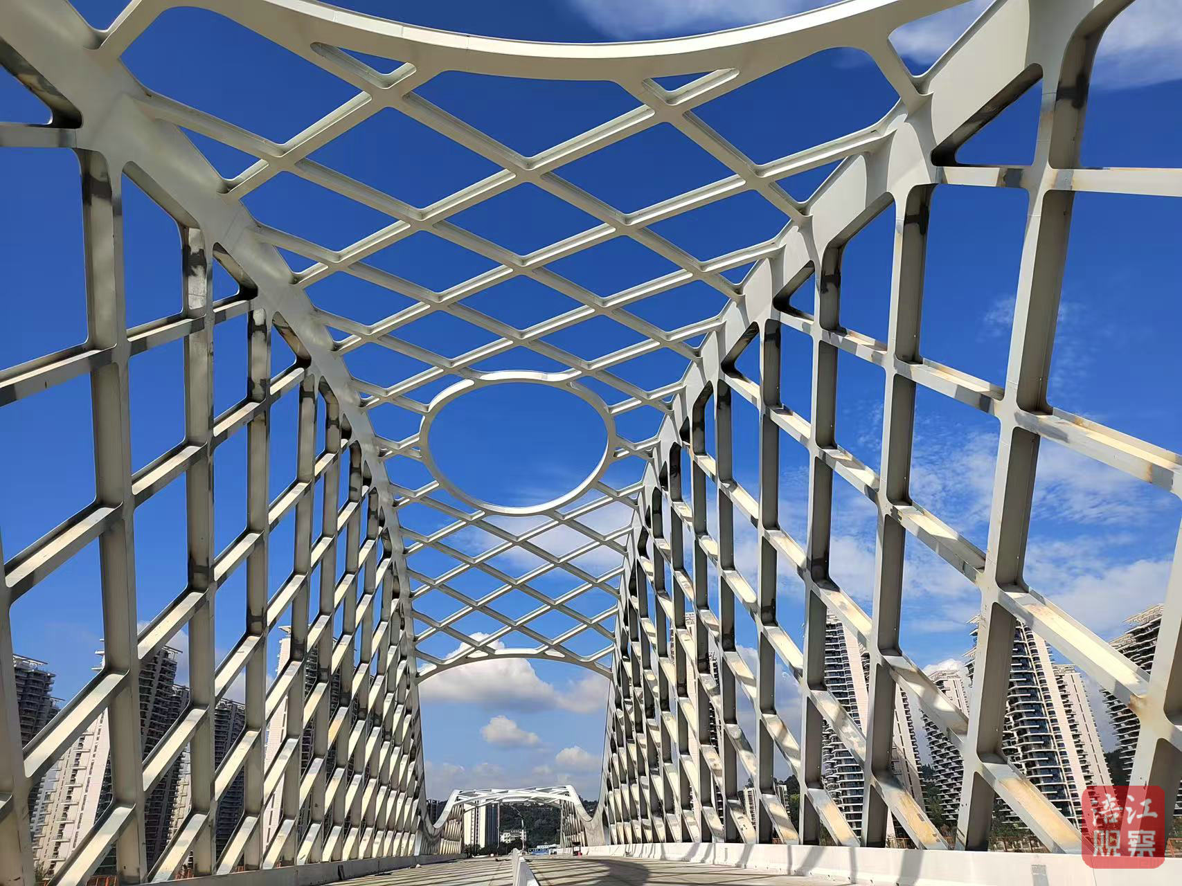 10月2日,记者在大桥涪城侧看到,大桥西岸桥头(涪城侧)正在进行引桥桥面铺装层混凝土浇筑和主桥亮化工程灯架安装,主桥钢结构涂装也在井然有序地进行着,现场一派热火朝天的景象。刚刚完成铺设的沥青路面平整宽阔,黝黑发亮,宛如一条崭新的缎带,向远处延伸。
