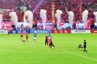 晚上7时许,在主持人的热烈开场白中,激光秀、无人机展演《双城情一家亲》、歌舞《相亲相爱一家人》等精彩节目陆续上演,让现场观众直呼“值回票价”!在一片欢呼声中,身着深蓝色战袍的德阳重装队、身披红色战衣的绵阳九洲长虹队球员陆续亮相。