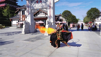潼川古城,川剧吐火表演。