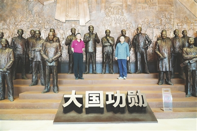 邓稼先之子邓志平(左)、于敏之子于辛(右)在父辈雕塑前合影