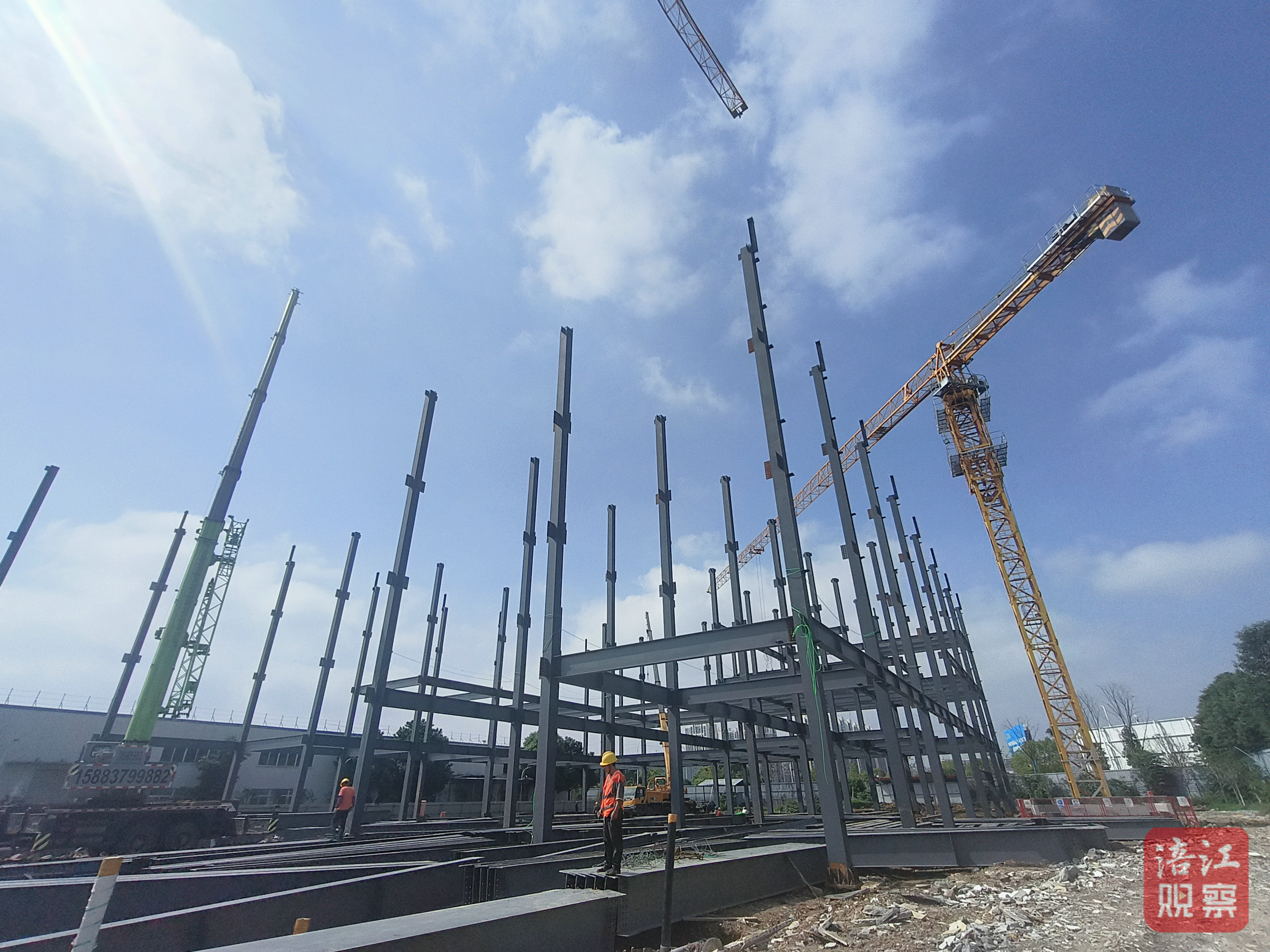 “目前,我们正在进行钢构的安装,钢柱和钢梁的安装都在同步推进,钢梁部分已经施工到三四层了。”施工现场负责人廖锋指着正在“生长”的厂房向记者介绍,“右边的综合办公楼主体楼板已经完成,二楼以上准备砌砖,底楼即将打垫层,我们正全力冲刺,确保今年12月底能够如期完工。”
