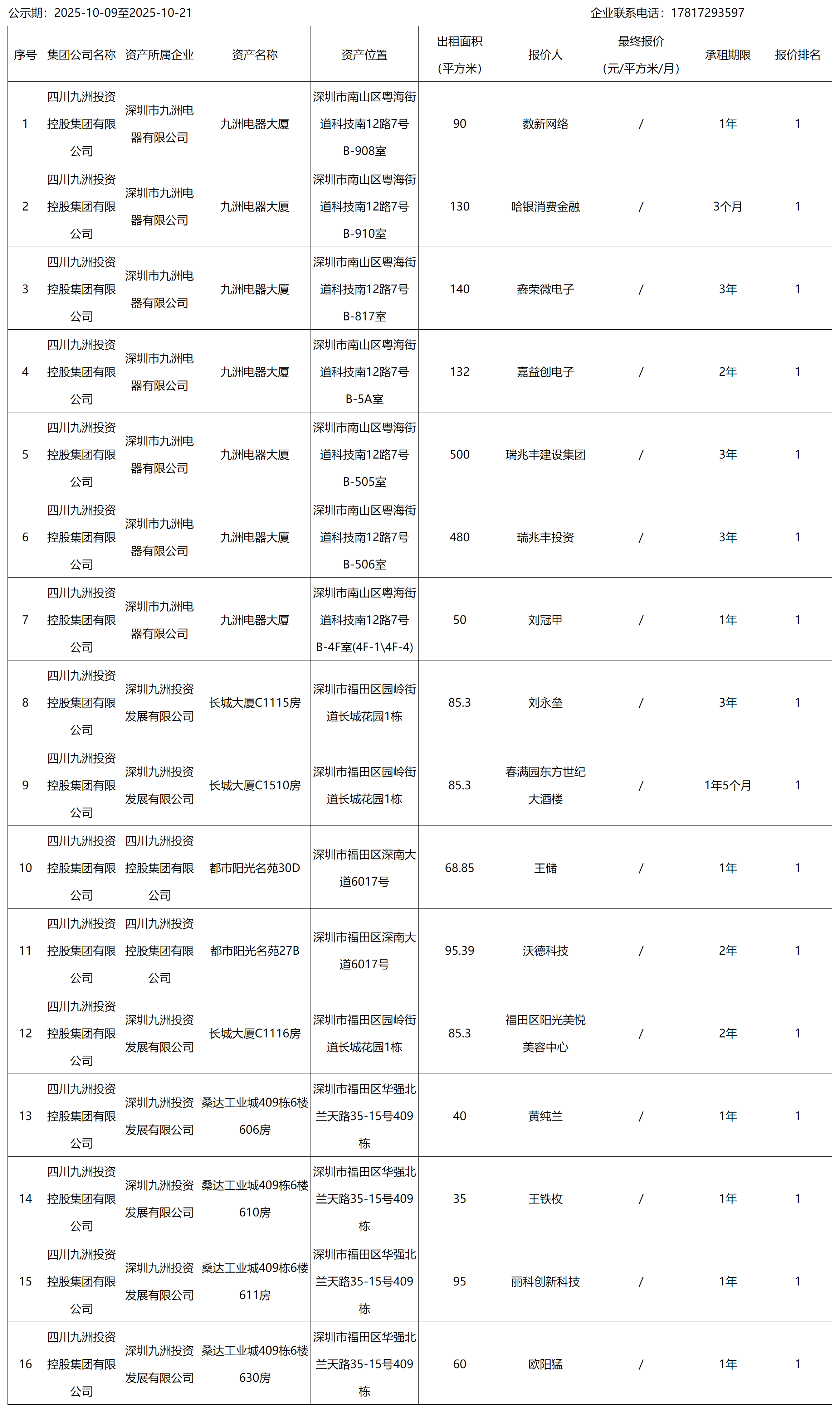 深圳市九洲光电子有限公司代管房产九洲电器大厦、长城大厦、都市阳光名苑、桑达409栋出租结果公示