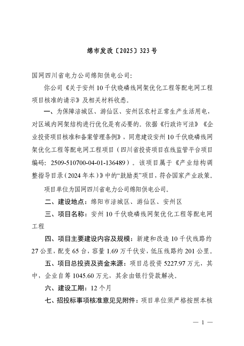 绵阳市发展和改革委员会关于安州10千伏晓磷线网架优化工程等配电网工程项目核准的批复