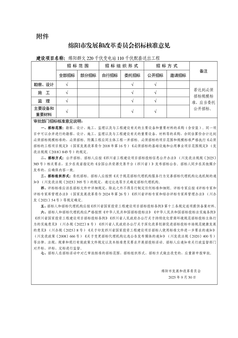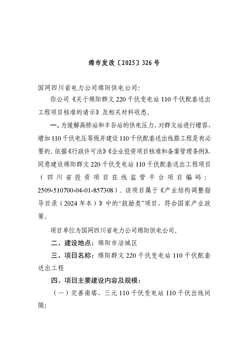 绵阳市发展和改革委员会关于绵阳群文220千伏变电站110千伏配套送出工程项目核准的批复