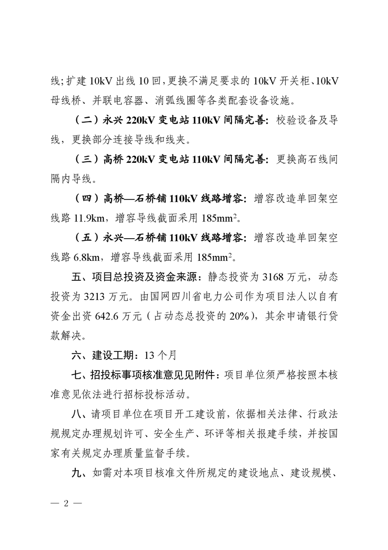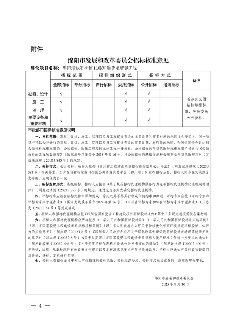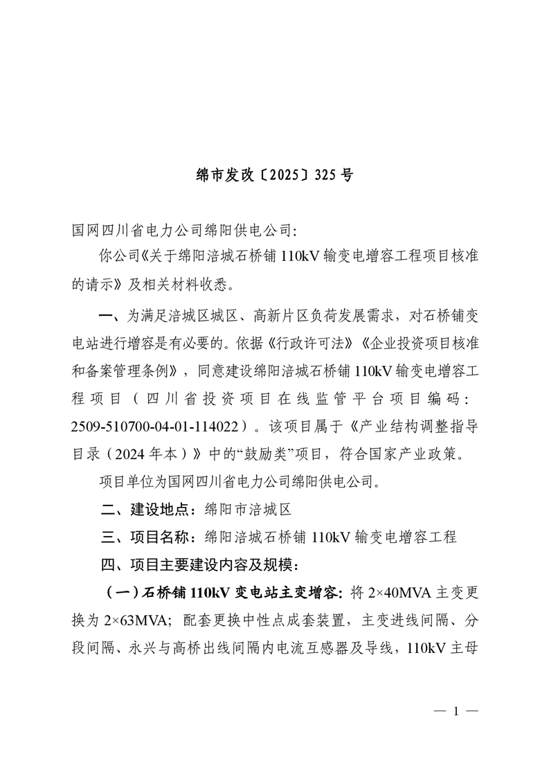 绵阳市发展和改革委员会关于绵阳涪城石桥铺110kV输变电增容工程项目核准的批复