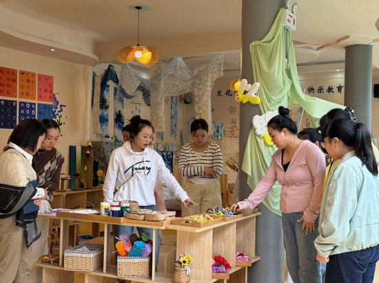 在党支部副书记薛梅的带领下,行政团队与全体教师深入各班,对扎染、面塑、造纸等八大非遗区角进行现场观摩与研讨。