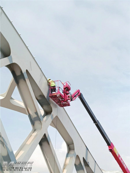 顺着青石路涪江大桥项目施工单位现场负责人柯所安手指的方向,记者看到,桥身两侧,人行电梯施工正酣,吊装机械将轿厢部件轻放至高空平台,系着安全绳的工人悬于半空,指尖精准拧动对接螺栓。桥塔外侧,幕墙安装工踩着吊篮移动,一块块玻璃模块在他手中严丝合缝拼接,倒映着江面波光。桥面上,现浇铺装层的钢筋骨架如列阵卫士,防撞防护栏施工点焊花四溅,光彩照明施工处,一盏盏灯具嵌入预设点位,建设者们各司其职,向大桥通途成型发起最后的冲刺。