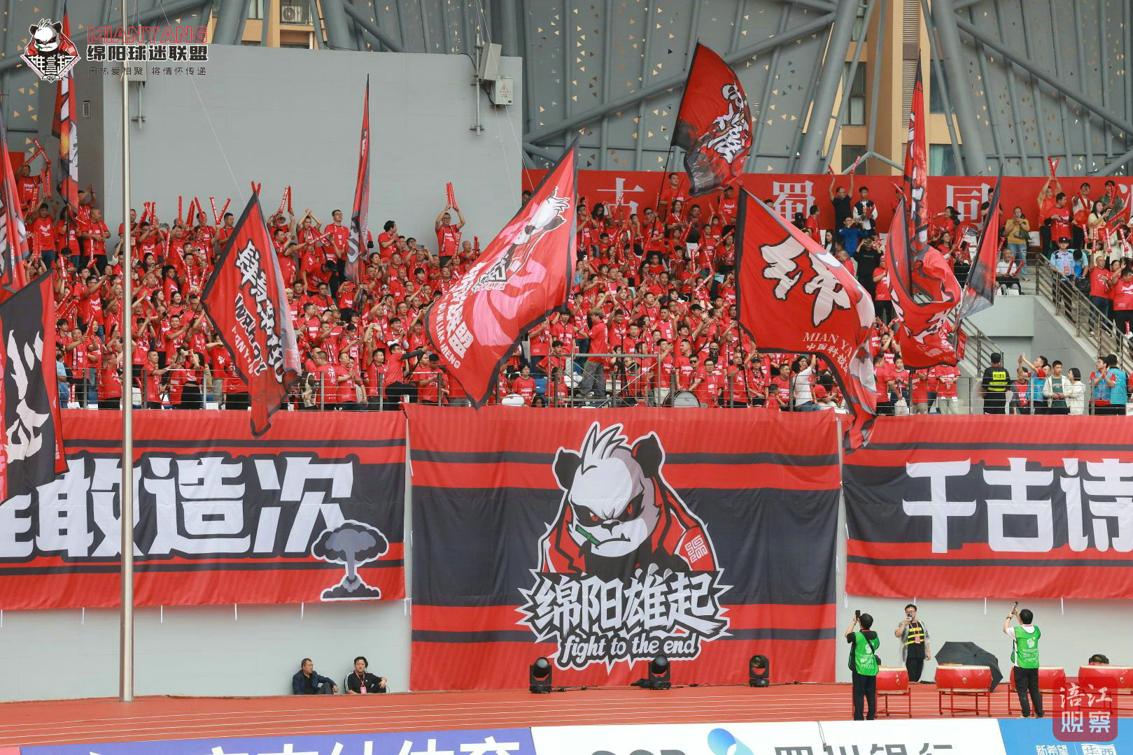 在旗帜规模与设计上,绵阳球迷联盟下足了功夫。除了4米×4.85米的主旗,他们还牵头制作了副旗、区域旗和战斗旗。比赛时,宋世兴高擎主旗在看台中央飘扬,副旗和区域旗在两侧呼应,战斗旗则在球迷方阵中穿梭,形成“遍地开花”的旗阵。