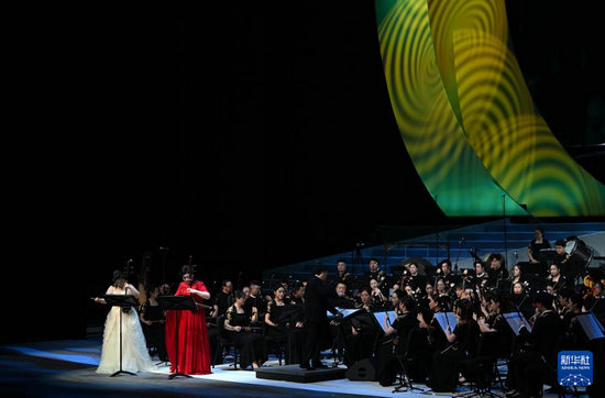 10月16日,胡琴表演艺术家宋飞(前右)、张钟云(前左)在第十一届丝绸之路国际艺术节开幕式上表演。