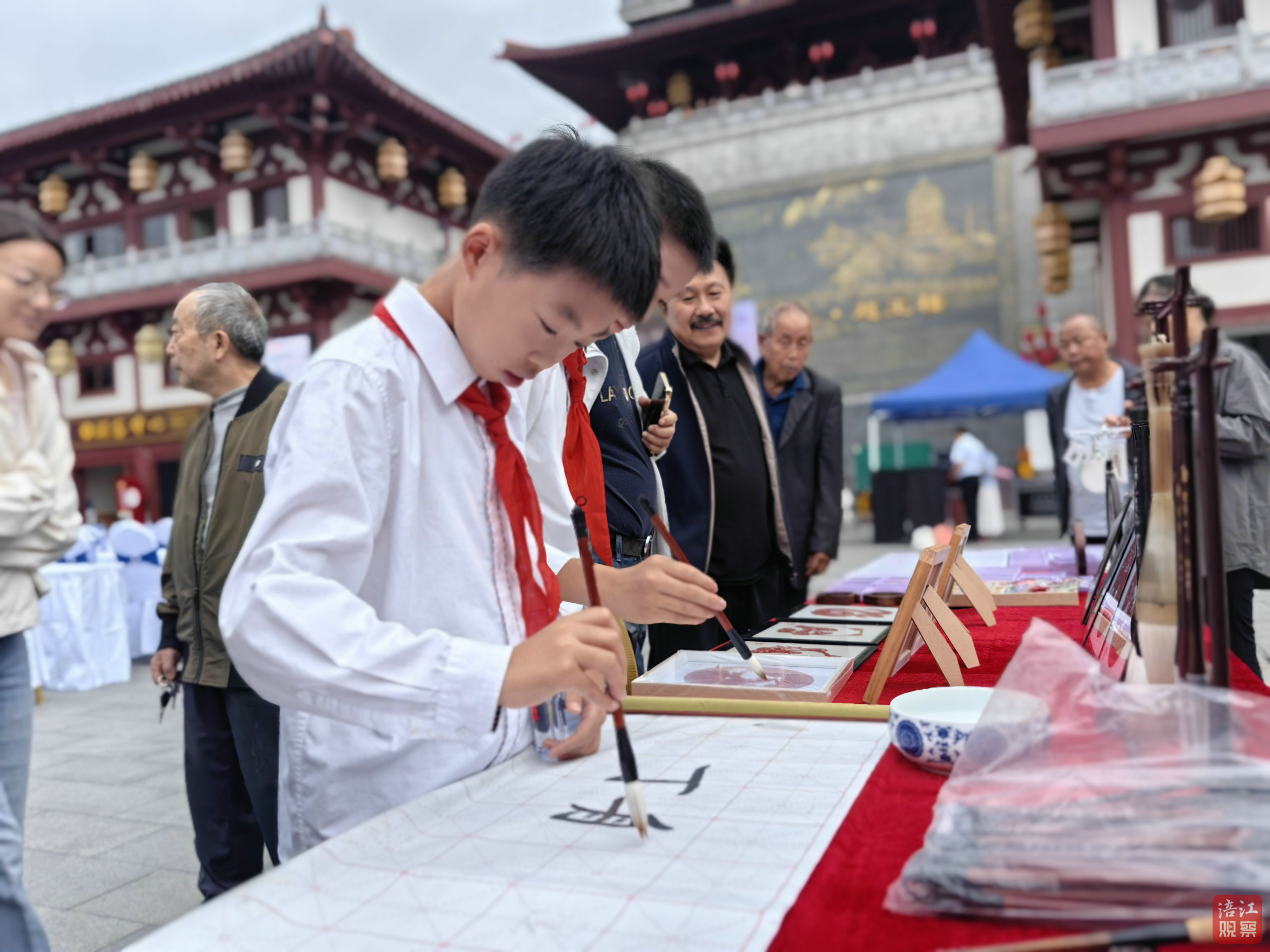 2025天府书展绵阳分展场启动仪式现场,小朋友体验毛笔书写