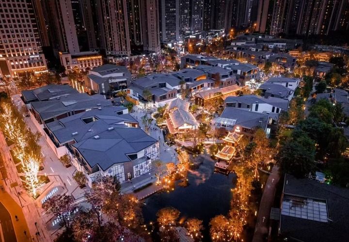 铁像寺水街靠近明代古刹铁像寺、依托肖家河滨水而建,新中式古典建筑风格融合古塔、古桥、牌坊、川西林盘等天府文化元素,在鳞次栉比的高楼大厦中辟出一片独特的开放式漫游空间。