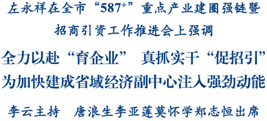 左永祥在讲话中指出,今年以来,我们把推进重点产业建圈强链作为以科技创新引领产业创新、加快发展新质生产力、扎实推进高质量发展的重要着力点和突破口,把产业建圈强链行动作为“八大行动”之一摆在重要位置来抓,推动工作机制和推进模式不断完善,围绕产业链招商引资工作取得了积极进展,相关工作开局有力、起势良好。全市上下要保持发展定力,创新思路举措,以建圈强链为引领、“587+”产业体系为方向,以“拼”的姿态、“实”的作风,抓紧抓实招商引资工作,持续强链主、聚链属、延链条,不断提升我市现代化产业体系发展能级和水平。
