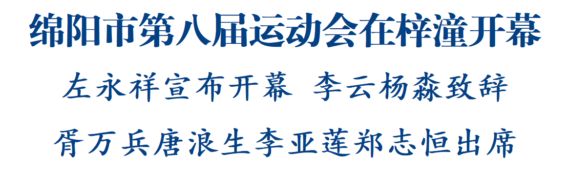 10月21日下午,“绵商银行杯”绵阳市第八届运动会在梓潼开幕。省委常委、市委书记左永祥出席开幕式并宣布开幕。市委副书记、市长李云,省体育局副局长杨淼出席开幕式并致辞。成都体育学院党委副书记、院长胥万兵,市人大常委会主任唐浪生,市政协主席李亚莲,市委常委、科技城管委会主任郑志恒出席开幕式。