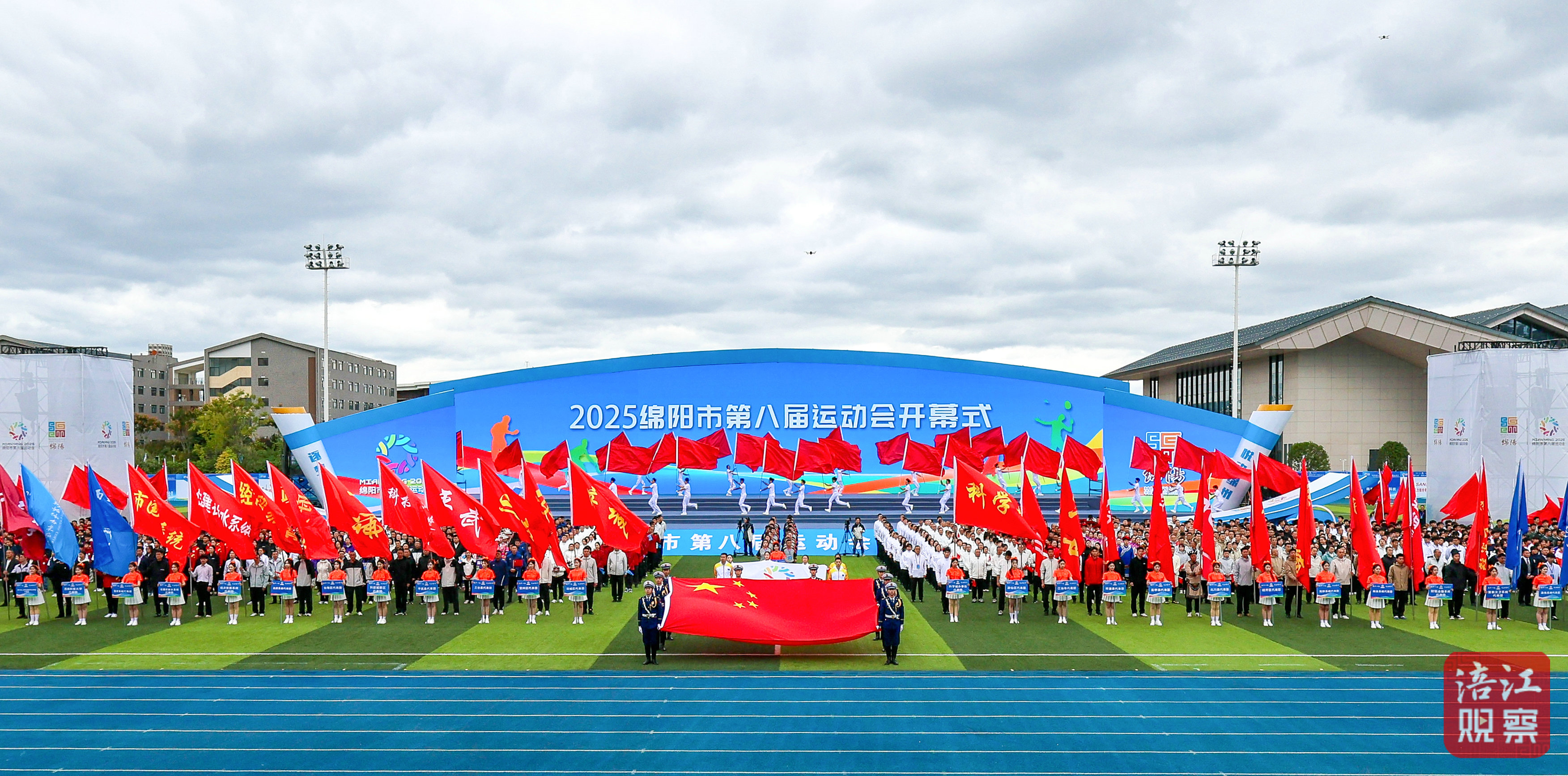 14时30分,绵阳市第八届运动会开幕式正式开始。伴随着激昂澎湃的旋律,国旗护卫队高举着五星红旗步入会场,镌刻着八组跃动人形环抱构成的绵阳市第八届运动会会旗紧随其后。裁判员、各代表团及方队迈着矫健步伐依次入场,充分展示了绵阳人民昂扬向上、奋发有为的精神面貌。入场式后,全场起立,齐声高唱中华人民共和国国歌。在雄壮国歌声中,鲜艳的五星红旗冉冉升起,迎风飘扬。