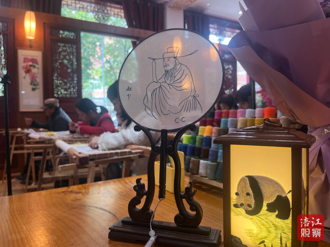 绣架前,学员陈建蓉的身影格外引人注目。她的右眼失明,左眼视力仅0.1,因此她需要将脸贴近绣布才能辨识针脚。但就在这样的状态下,“李白举杯邀明月”的诗意画卷一针一线地缓缓呈现。