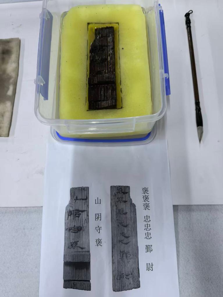 记者看到,有一件文书检已经识读出来,两面均是清晰的汉隶字体,正面墨书“山阴守褒”,反面墨书“褒褒褒 忠忠忠 鄞尉”。李龙彬告诉记者,这应是当时官员练习书写的文书检。习字内容可能与会稽太守对鄞县县尉的嘉奖有关。(记者冯源)