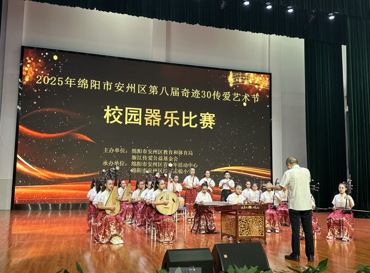 10月16日上午,2025年安州区第八届奇迹30传爱艺术节校园器乐比赛在沙汀实验小学演播厅圆满落幕。安州区永盛小学凭借精湛的民乐演奏技艺,从众多参赛队伍中脱颖而出,斩获民乐特等奖。