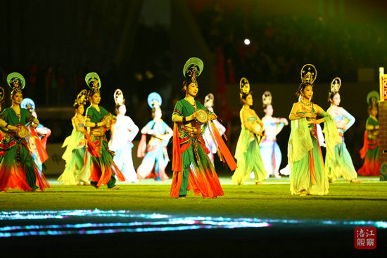 紧接着,体现绵阳和广元历史文化元素的大型古风融合秀《郪风唐韵》唯美来袭。380余名表演者随歌而舞,衣袂翩跹,伴随着大型立鼓敲响,2只飞天凤凰绕场飞翔助阵将现场气氛推向了高潮。