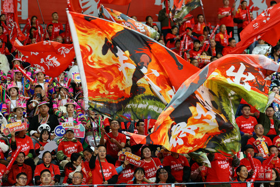 19时30分,在一片欢呼声中,身着白色战袍的广元剑门雄关队、身披红色战衣的绵阳九洲长虹队球员陆续亮相。