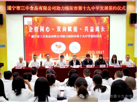 此次签约,是政企校协同育人的生动实践。绵阳经开区社会事业党委副书记杨果在现场对两方助力给予高度肯定,他指出,绵阳中学英才学校的领办,是优质教育资源辐射的“标杆实践”;遂宁市三丰食品有限公司的参与,是企业反哺社会的“典范担当”。三方携手不仅为十九中搭建了“专业赋能+资源支撑”的发展平台,更探索出一条“政府搭台、校企唱戏、学子受益”的教育均衡新路径。