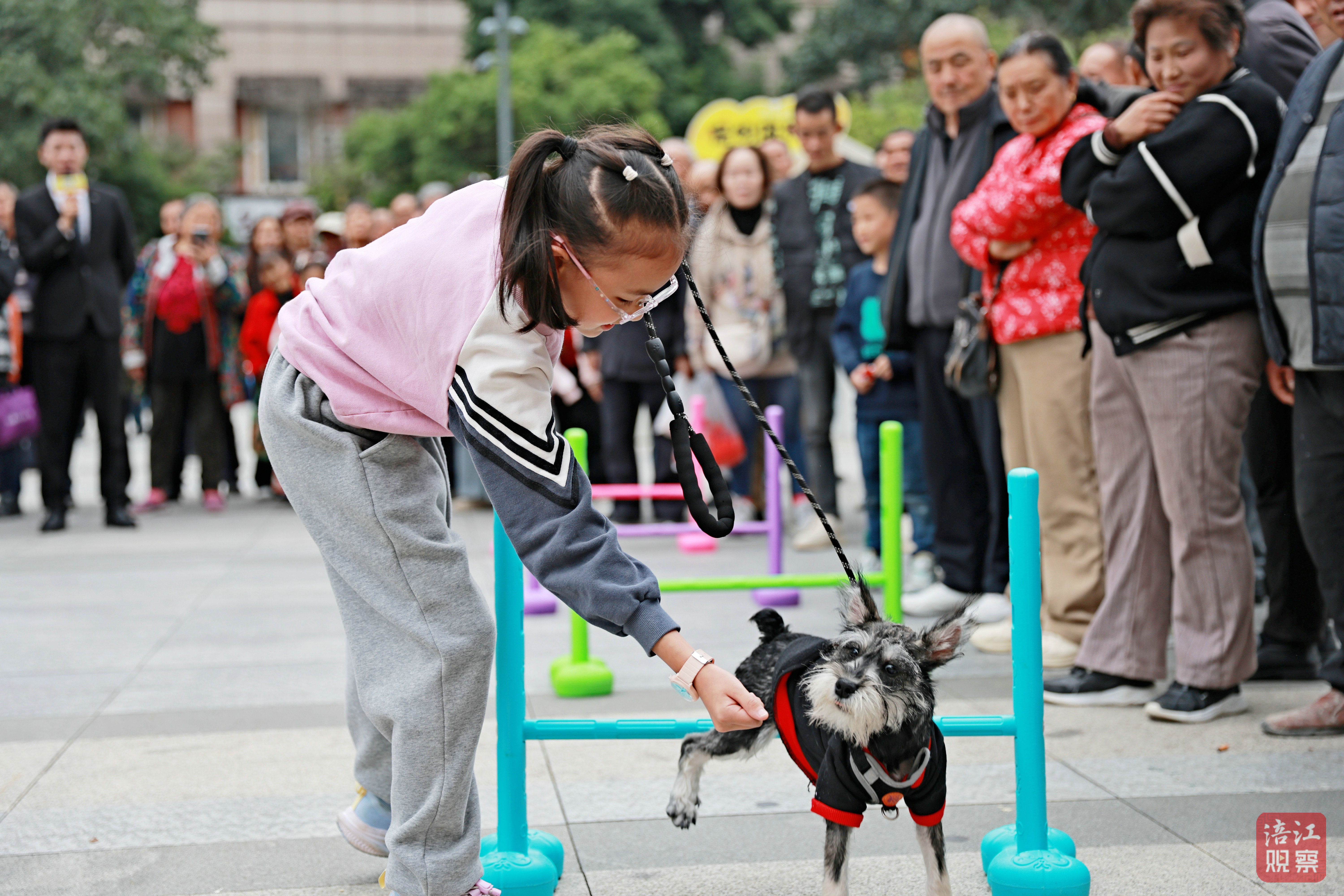 铁牛广场两侧还设置了养犬宣传办证区、宠物体检区、流浪犬领养区等多个区域,市民们通过问答互动或拍照打卡领取宠物零食、环保袋等礼品,萌宠比赛中,狗狗在主人引导下穿越障碍,场面欢乐。