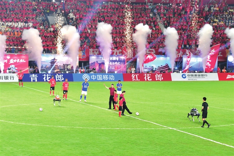 其一,“在地性”极强。举个例子,10月7日的川超绵阳主场开幕式上,开球嘉宾搭乘的无人驾驶公交车、现场迎宾的长虹机器人、装载比赛用球的“机器狼”,均出自绵阳本地企业或本地科研成果。很显然,这种本地化科技装备与红色文化、体育竞技的结合,既避免了“外来科技”的违和感,又进一步彰显了“科技城”的定位,由此带给游客和市民的独特体验感,是一般城市所无法比拟的。