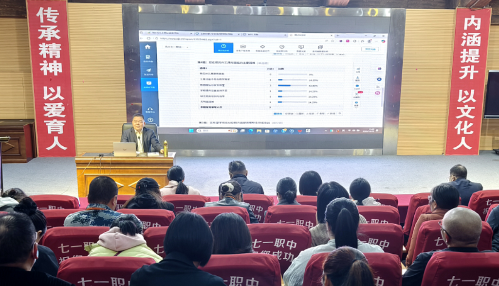 绵阳新闻网讯 为了积极响应教育数字化转型号召,切实提升教师人工智能应用能力与信息素养,10 月23 日,北川羌族自治县“七一”职业中学特邀绵阳职业技术学院冯德勇副教授,为全校教师带来《AI教师生产力倍增计划:60分钟极速破局》的专题讲座,以 “理论+实操” 的沉浸式培训,助力教师解锁人机协同教学新范式。