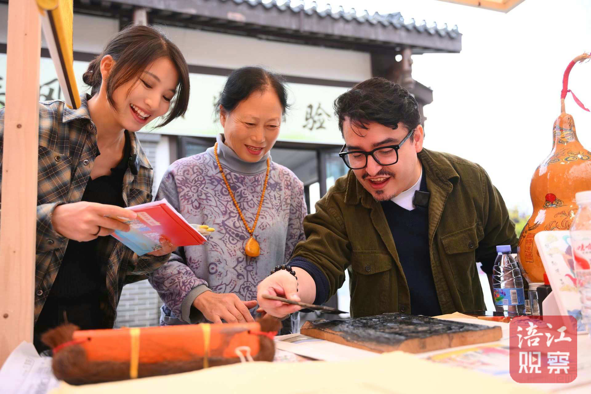在非遗体验区,游客们跟着非遗传承人亲手解锁“老绵阳的浪漫”。省级非遗项目梓潼木刻年画代表性传承人罗智婉,用刷子将墨水刷匀,再将毛边纸平铺于木板上,最后用趟子由上至下印制,一幅完整的作品就诞生了。最后再落款、盖章,几分钟时间,一幅属于游客的梓潼木刻年画作品就诞生了!
