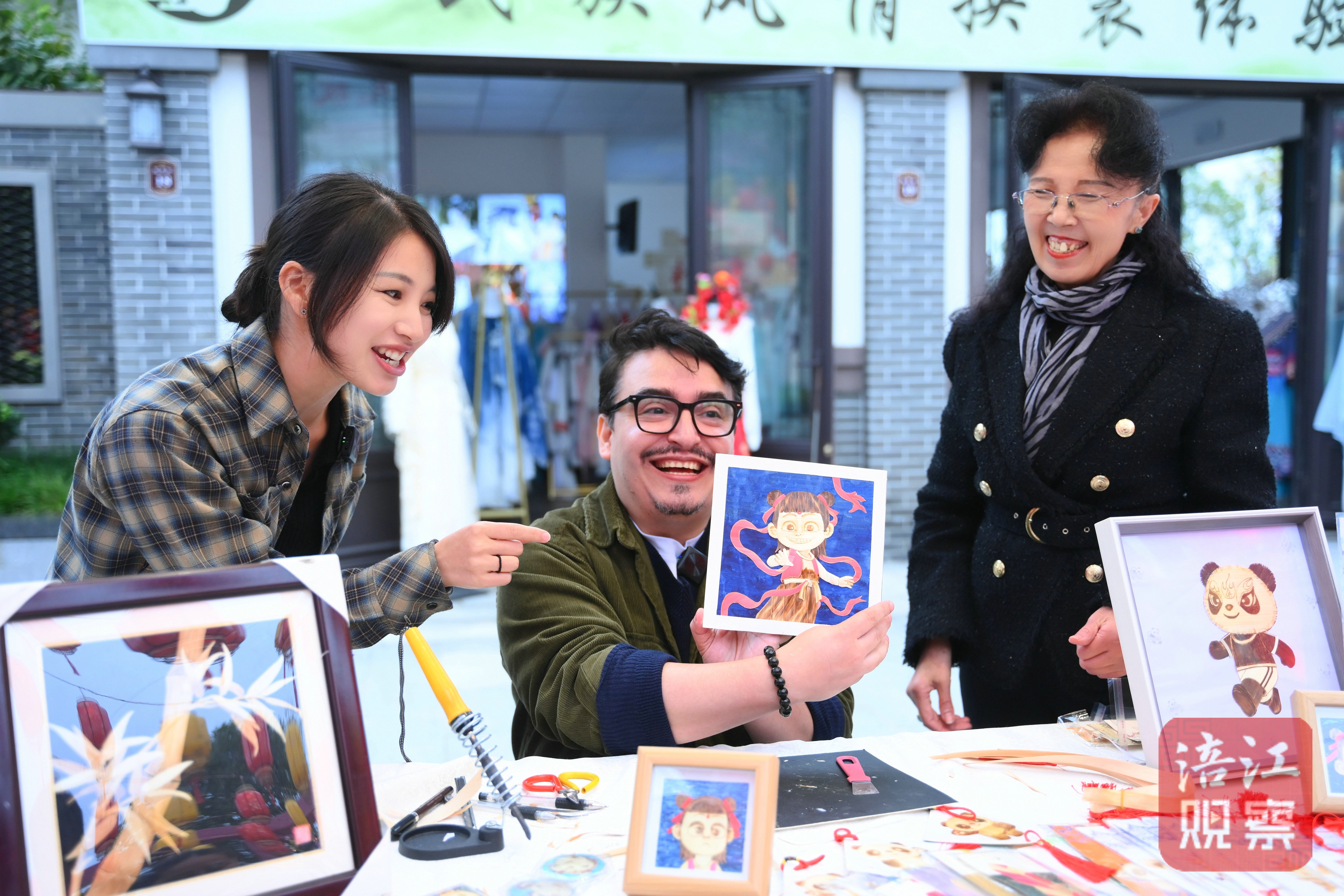 在市级非遗项目三台麦秆烙画的摊位,中国美术学院的学生肖慧元,正在非遗传承人龙怡珍的指导下,进行该项目的体验。刮薄了的麦秆条,根据基础图案,顺着羽毛生长的纹路,使用刻刀等工具切割粘贴,再修剪成型,最后把握好力度、速度、温度,用烙铁来烫出颜色的深浅层次。