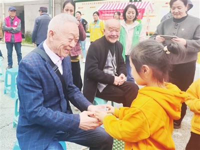 ①在安州区雎水镇,小朋友将热茶送到老人手中。