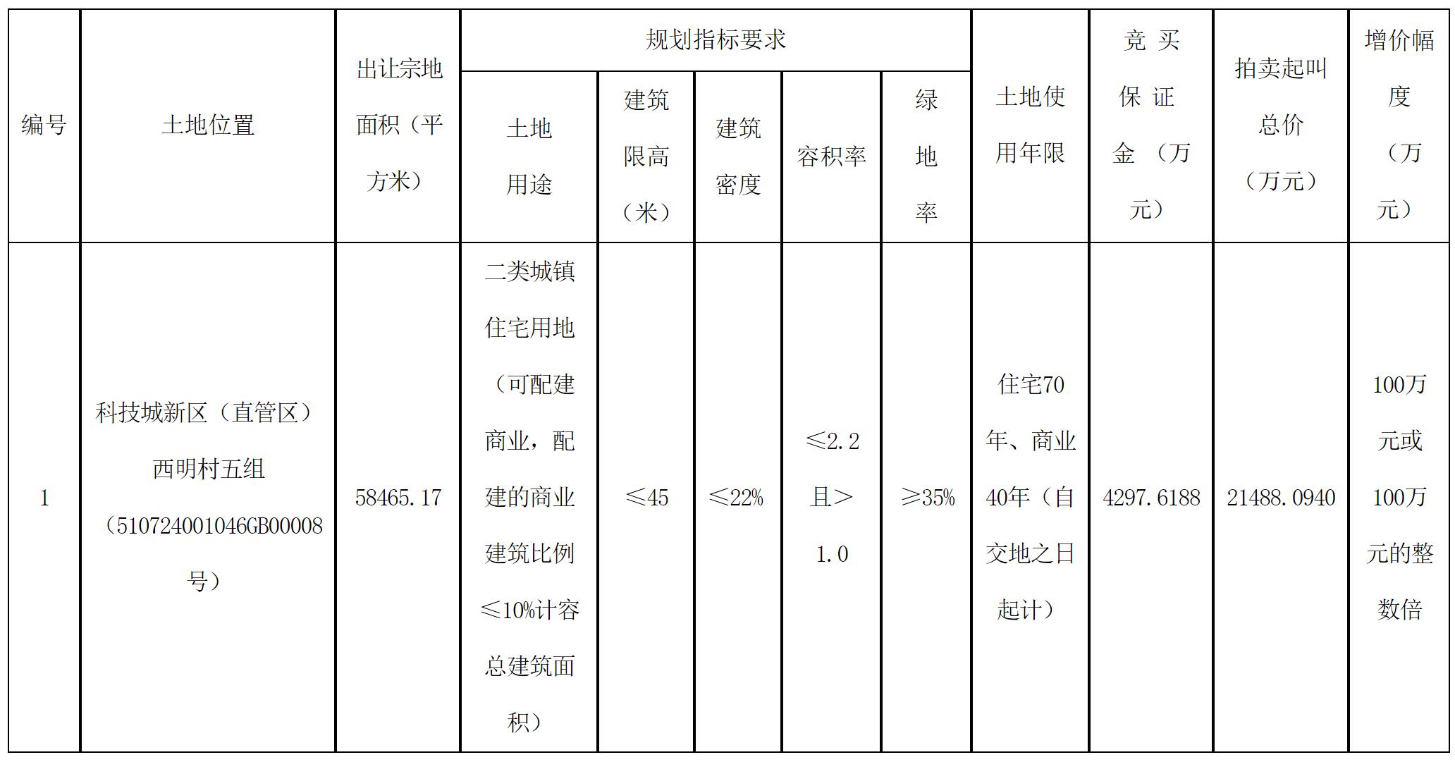 经绵阳市人民政府批准,绵阳科技城新区管理委员会决定以拍卖方式出让一宗国有建设用地使用权,绵阳市公共资源交易服务中心具体组织实施本次拍卖出让活动,现将有关事项公告如下: