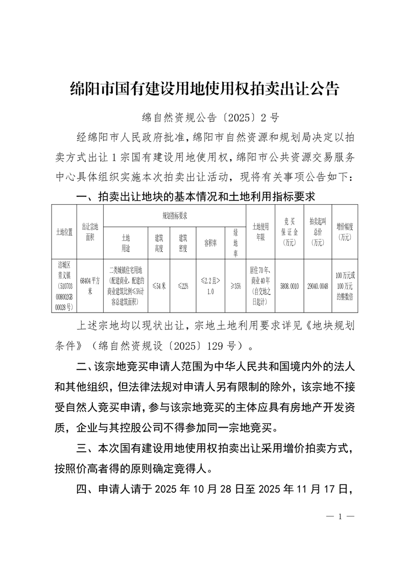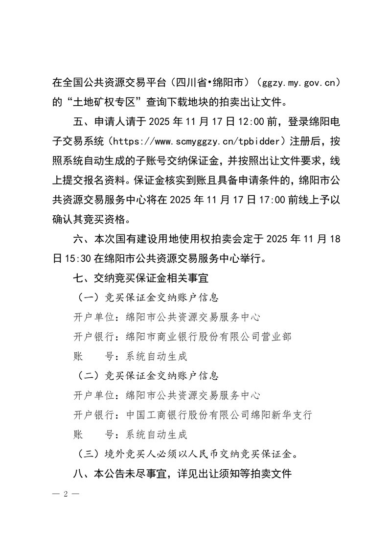 绵阳市国有建设用地使用权拍卖出让公告(绵自然资规公告〔2025〕2号)