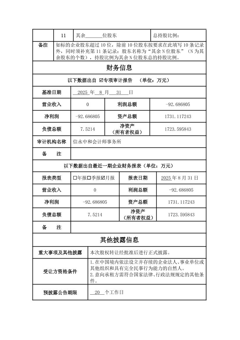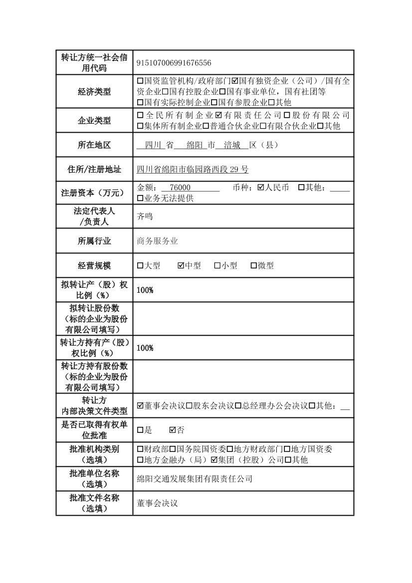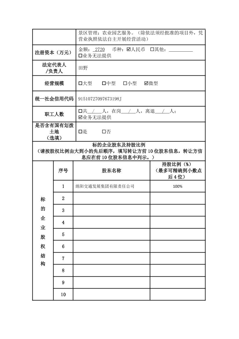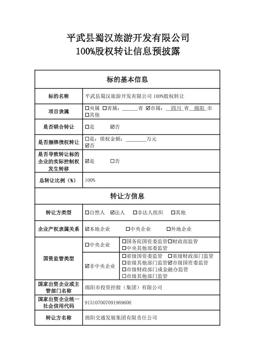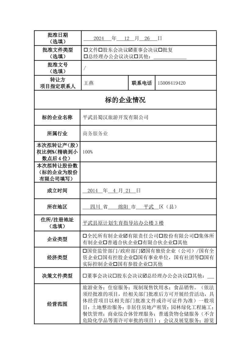 平武县蜀汉旅游开发有限公司100%股权转让信息预披露
