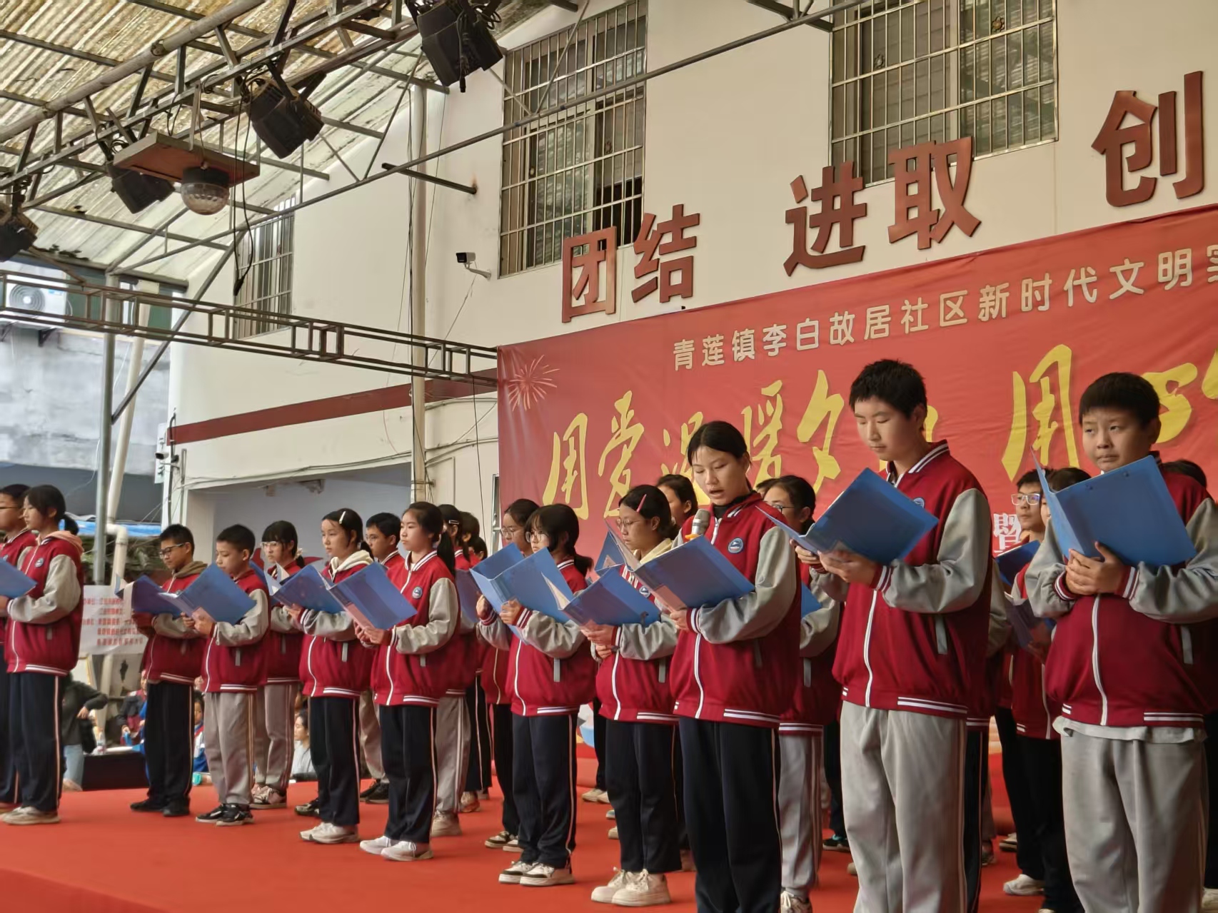 随后,青莲初中的学子们为在场的爷爷奶奶们献上了精心准备的文艺节目。首先登场的是经典诵读《我爱你,中国》。同学们精神饱满,声情并茂,用铿锵有力而又饱含深情的语调,朗诵出对祖国壮丽山河和悠久历史的无限热爱与赞美。字字句句,激荡人心,不仅展现了青莲学子良好的精神风貌,更将爱国主义的种子播撒在心田,引发了在场所有人的强烈共鸣,现场掌声经久不息。