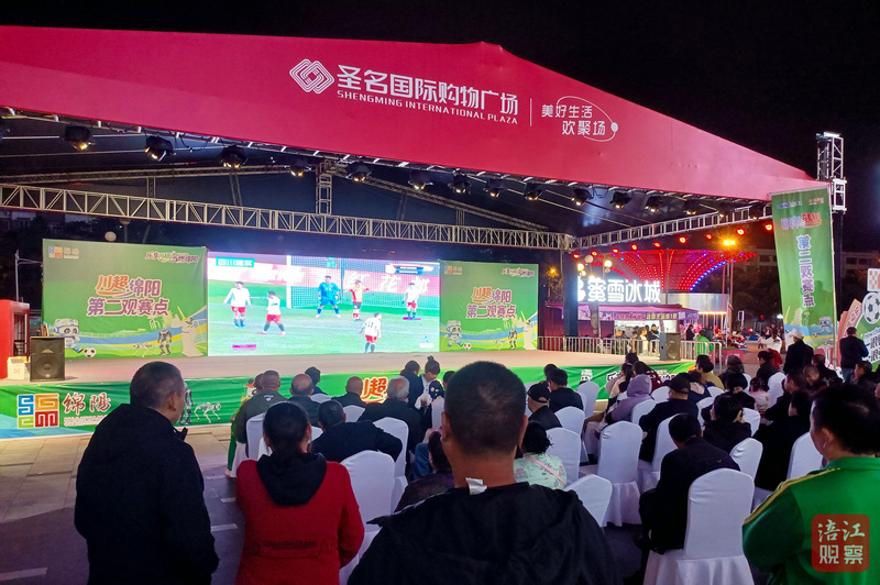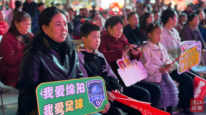 作为绵阳江油市的第二观赛点,圣名国际购物广场也是人声鼎沸、热闹非凡。球迷挥舞旗帜呐喊助威,观众也纷纷晃动手中的氛围牌为绵阳队加油。