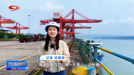 记者 侯雨森:我现在在四川第一大港——泸州港,在我身后,一艘从上海驶来的货轮刚刚停靠,桥吊正将集装箱从货船上吊出,并送往堆场等待转运。我们也感受到了四川水运的强劲脉动。