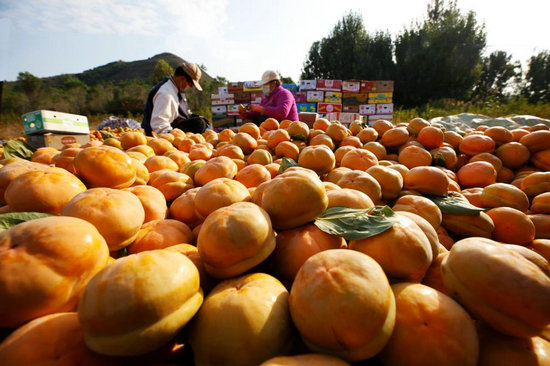 在保定市满城区神星镇果品交易市场,磨盘柿堆积如山。新华社记者 邹尚伯 摄